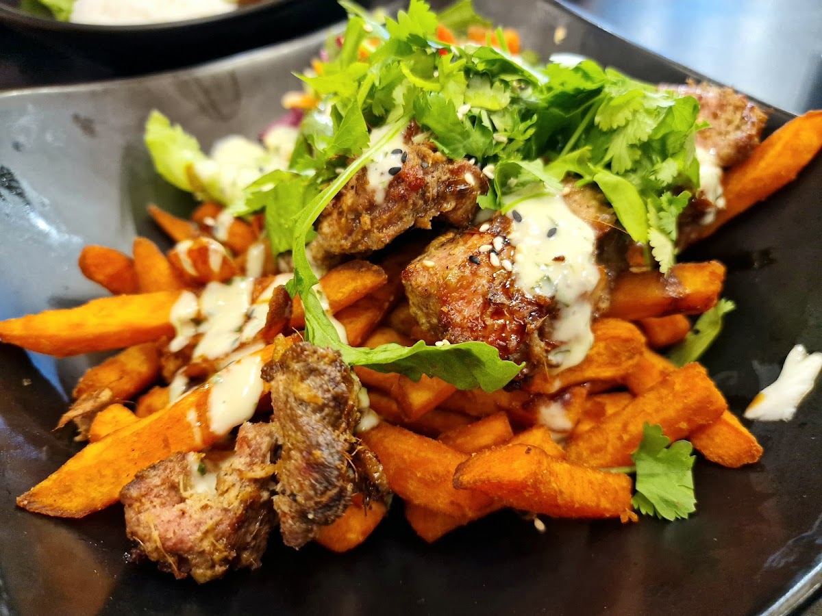 The menu leans on a mix of grilled and roasted meats paired with interesting sauces and sides. Notable picks include roasted duck served alongside sweet potato fries and dishes featuring chicken with peanut or mango sauces—choices that seem carefully crafted to balance hearty and fresh flavors. Vegetarians have options too, though some items like tofu may not be for everyone, their presence indicates thoughtful inclusivity.